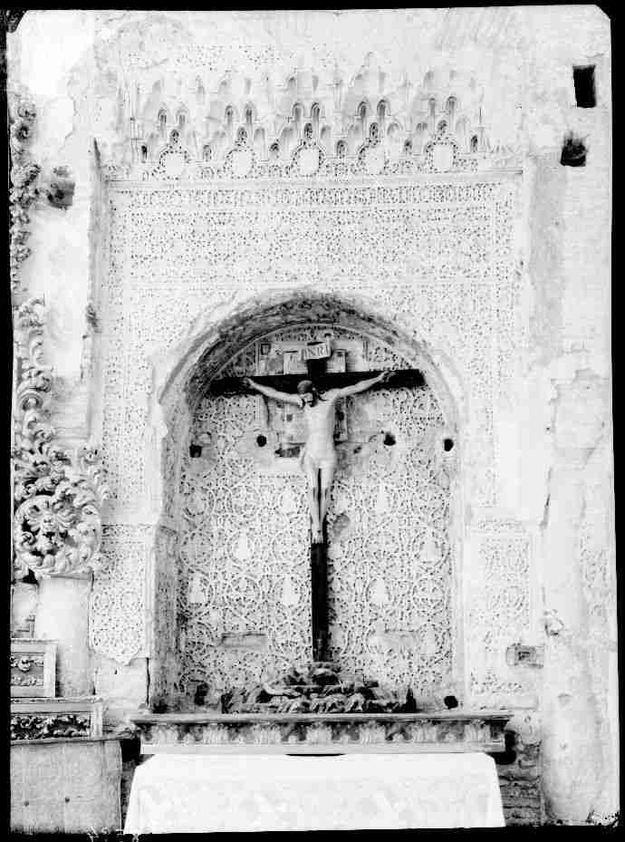 Referencias: Fotografía 1: Del Archivo Moreno, IPCE, Ministerio de Educación, Cultura y Deporte. Licencia Creative Commons (by-nc-nd). Fotografía 2: Juan Carlos Nogales García • Sepulcro mudéjar de yesería consistente en un arco de medio punto enmarcado en una fachada rectangular decorada con roleos vegetales, flanqueado por dos columnas, cuyos fustes están formados por cipos árabes, uno de ellos con inscripción. Rodea la fachada una cinta con inscripción en caracteres monacales “Miserere mei Deus, secundum magnam misericordiam tuam”. Remata la parte superior una franja de mocárabes entre dos protomos humanos masculinos. El intrados del arco está decorado racimos y hojas de parra. En el fondo, sobre una decoración de roleos, destacan cuatro filas con tres siluetas humanas planas cada una y una lápida con el epitafio de Alfonso Pérez (ver ficha MAVIT 000113). • Fue descubierto en junio de 1912 bajo un retablo, aunque ya había dado noticia de su existencia Manuel González Simancas en 1900, en el Boletín de la Sociedad Arqueológica de Toledo. • La decoración del intrados del arco es idéntica a la del llamado arco de los pavones del Palacio del Rey don Pedro y las siluetas humanas guardan similitudes con las yeserías de llamado Arco del Obispo y las del palacio de Suer Téllez de Meneses. • Otros sepulcros mudéjares conservados en Toledo: el de Fernán Péres (1278) en la Capilla de Belén (MAVIT 000073), el de Lupus Fernandi (1312) en el Claustro de la Concepción Francisca (MAVIT 000096) y el de Fernán Gudiel (1278) en la Catedral de Toledo (MAVIT 000105). CODERA Y ZAIDÍN, Francisco; ”Sepulcro mudéjar e inscripción árabe descubiertos en Toledo”; Boletín de la Real Academia de la Historia, Tomo 62 (1913), pp. 338-341 DE SAN ROMÁN, F.B.; «La parroquia de San Andrés. Notas históricas»; Toletum: Boletín de la Real Academia de Bellas Artes y Ciencias Históricas de Toledo (1984, segunda época, nº 15); pág 210-211 CASTAÑOS Y MONTIJANO, Manuel; “Sepulcro mudéjar de San Andrés, de Toledo”; ARTE ESPAÑOL. Revista de la Sociedad de Amigos del Arte; MADRID, 1918; Año VII.-Tomo IV.-Núm. 1, pág 18 PAVÓN MALDONADO, Basilio; "Tratado de Arquitectura Hispano-Musulmana:Palacios. III"; CSIC Press, Madrid 2004; págs. 694-695 |
