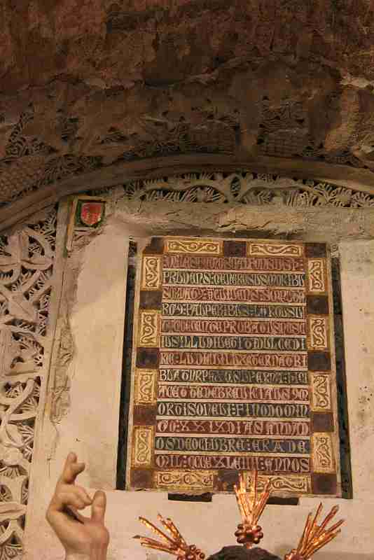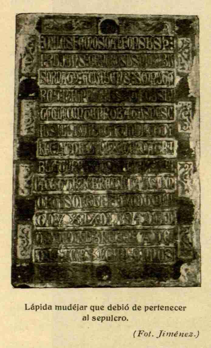 Referencias: Fotografía 1: Jiménez en ARTE ESPAÑOL. Revista de la Sociedad de Amigos del Arte (1918) Fotografía 2: Juan Carlos Nogales García • Al ser descubierto, en junio de 1912, el sepulcro mudéjar de la iglesia de San Andrés (MAVIT 000112) apareció vacío el espacio para contener la lápida del difunto, posiblemente se arrancó al superponer el retablo que lo tapaba. En esta iglesia, sobre un sepulcro gótico florido, del siglo XV, en la capilla de la Epifanía, se encontraba una lápida fechada en 1306. La coincidencia de dimensiones y fechas hacen suponer que pertenece al sepulcro mudéjar (discrepa Pavón Maldonado que data las yeserías a mediados del siglo XIV, indicando que lápida y yeserías parecen no corresponderse). • El epitafio corresponde a un tal Alfonso Pérez: “MILES FAMOSO ALFONSUS P/RUDENS GENEROSUS MORIBUIS ORNAT[us] AC VIVENS S[e]MP[er] UT A/RG[U] PAUPERIBUS LARGUS VI/TAQ[ue] DECENTE PROBATUS NESC/IUS ILLUDI VEZITI DUCEDI/RIE LUDICUI LUX ETERNA TRI/BUAT NR PAX Q[ue] SUPERNA HIC I/ACET TE DE BREVICIA M/ORTIS ONEVI FINO DOMIN/GO XXIX DIAS ANDAD/OS DE OCHUBRE ERA DE/MIL CCC E XL IIII ANNOS”. Alfonso Pérez, militar famoso, prudente, generoso, adornado de buenas costumbres, siempre vigilante, cual otro Argos, dadivoso para con los pobres y muy estimado por la honradez de su vida, nunca se dejó seducir por la dulzura de los placeres prohibidos. Séanle concedidas luz eterna y paz celestial. Aquí yace... Murió el domingo 29 de octubre de la era 1344 (año 1306). • La fecha de defunción está indicada en el sistema de era Hispánica y días andados. CEDILLO, Jerónimo López de Ayala y Álvarez de Toledo, Conde de; “Toledo : Guía artístico-práctica”; Toledo 1890; Menor y Hermanos; pág. 1008-1009. CODERA Y ZAIDÍN, Francisco; ”Sepulcro mudéjar e inscripción árabe descubiertos en Toledo”; Boletín de la Real Academia de la Historia, Tomo 62 (1913), pp. 338-341 DE SAN ROMÁN, F.B.; «La parroquia de San Andrés. Notas históricas»;Toletum: Boletín de la Real Academia de Bellas Artes y Ciencias Históricas de Toledo (1984, segunda época, nº 15); pág 210-211 CASTAÑOS Y MONTIJANO, Manuel; “Sepulcro mudéjar de San Andrés, de Toledo”; ARTE ESPAÑOL. Revista de la Sociedad de Amigos del Arte; MADRID, 1918; Año VII.-Tomo IV.-Núm. 1, pág 18 PAVÓN MALDONADO, Basilio; "Tratado de Arquitectura Hispano-Musulmana:Palacios. III"; CSIC Press, Madrid 2004; págs. 694-695 |