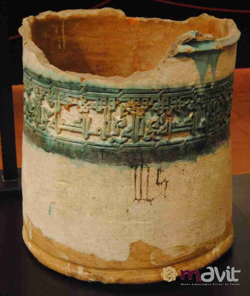 Objeto: Brocal de la calle San Ildefonso Contexto cultural: Cristiano Mudéjar Datación: Siglo XIV Material: Barro vidriado Procedencia: Calle san Ildefonso, Toledo Ubicación actual: Museo de Santa Cruz, Toledo Estado de visibilidad actual: Visible Dimensiones: 0,54 m de alto por 0,50 de diámetro |