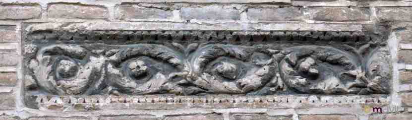 Referencias: • Relieve romano empotrado en la fachada de la iglesia de San Vicente de Toledo, actual Circulo del Arte. • Consta de decoración vegetal de finas guirnaldas de hojas de acanto que se cruzan formando ochos que inscriben una roseta de cuatro pétalos, típicas del Bajo imperio romano. • Paralelos en la decoración del Arco de los Plateros en el Foro Boario y en un fragmento de relieve de Mérida. GARCÍA SÁNCHEZ DE PEDRO, Julián; “Proyecto de intervención arquitectónica de la torre de la iglesia de San Vicente (Toledo). Informe final de intervención arqueológica”, Consorcio de Toledo. |