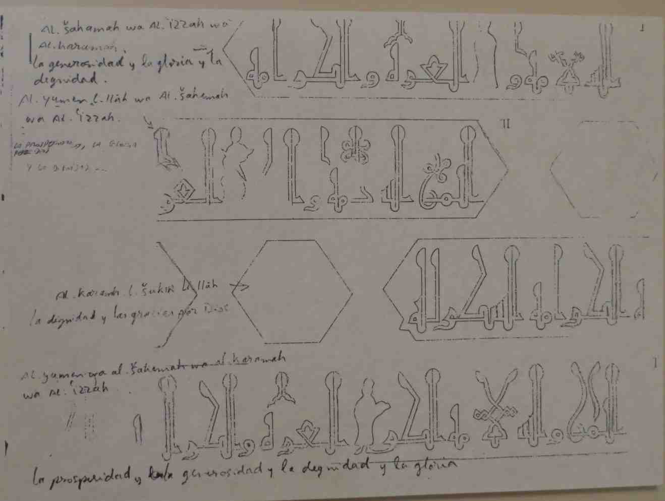 Referencias: Basilio Pavón Maldonado lo relaciona con las yeserías toledanas del s XIV que integran figuras humanas en vegetación, en concreto: -Arcosolio de la Iglesia San Andrés de Toledo (MAVIT:000112) -Las yeserías en el Seminario Menor (p224-225 en "Tesoros Artísticos de Toledo" de Renate Takkenberg-Krohn) -El llamado arco del obispo en una mansión de la Bajada de San Justo. BASILIO PAVÓN MALDONADO: Iconografía hispanomusulmana (Matizaciones y connotaciones): Naturalismo, fauna y el árbol de la vida Fig. 41.2 "Siluetas sagradas entre letreros árabes de carácteres cúficos, palacio episcopal de Cuenca." |