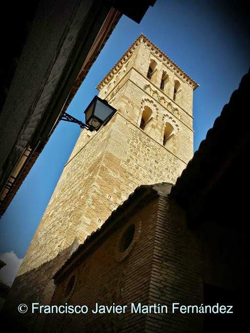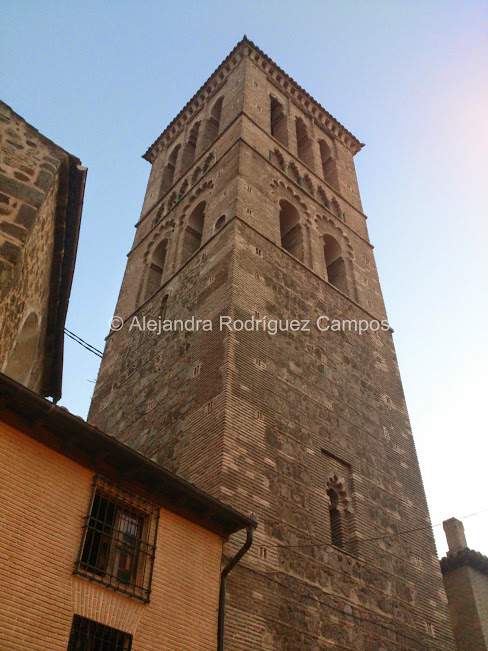 Así, el cuerpo inferior presenta mampostería encintada. Sobre éste, se superponen otros dos en ladrillo, ambos decorados con arquerías. El primero, más bajo, se abre por un doble arco de herradura cobijado por otro lobulado y, sobre éstos, un friso de arquillos ciegos pentalobulados que descansan sobre seis columnillas de cerámica, que sirve de separación. En el cuerpo superior, el verdadero campanario, con triple ventana en cada uno de los lados, de herradura apuntados los laterales y pentalobulado el central. |