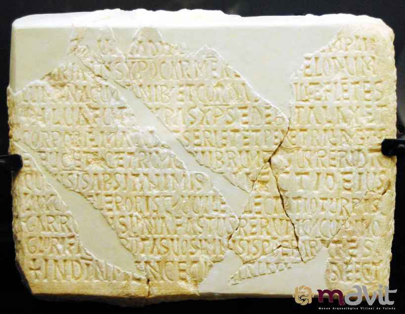 Referencias: N° de inventario 1999/46/1 • Apareció rota en once fragmentos, reutilizada como relleno, en un sondeo realizado en 1982 en la zona este de los restos de un edificio religioso del yacimiento de los Hitos (Arisgotas, Toledo). No se conserva completa, afectando la merma principalmente a las dos primeras líneas y a la última. • Transcripción y traducción Isabel Velázquez Soriano: [- c.4-] + + [h ?]unc aditum b [ -c. 7/8 t]empli / [i]ntrantis Xp(ist)o carme(n) re[citate?] melodum / lumina cum [m]anib(us) et corda s[usto]llite fle(n)tes / diluat ut c[ul]pas Xp(istu)s et debita laxet / corpora emacula[t]a servet et penetralia me(n)tis / effuget ac tetrum c[o]lubrum r[ur]su(m)q(ue) retrudat / quo u(e)s(tr)is absit animis inlectio eius / luxur[ia]e leporisq(ue) {u}uile oblectatio turpis / garru[lit]as uana fastus rerumq(ue) cupido. / glorific[ate] po(r?)tas uos imnis is po(n)e pare(n)tes. / (crux) in d(e)i n(o)m(in)e anc ecl[es]ia(m) +un+[-c.3-]do fecit. Traducción: ..........esta entrada..........del templo / ..........Recitad un cántico melodioso a Cristo / alzad llorando los ojos, junto con las manos, y los corazones / para que Cristo lave las culpas y condone las deudas, / conserve inmaculados los cuerpos y las interioridades de la mente / y ahuyente a la abominable serpiente y de nuevo la encierre / donde su seducción esté lejos de los espíritus justos [para que se aleje de vuestros espíritus su seducción] / donde (esté lejos) la vergonzosa deleitación de la lujuria y el encanto / la habladuría banal, la ostentación y la ambición de las riquezas / Glorificad vosotros las puertas tras las inmensas paredes / En el nombre de Dios (...) hizo esta iglesia. |