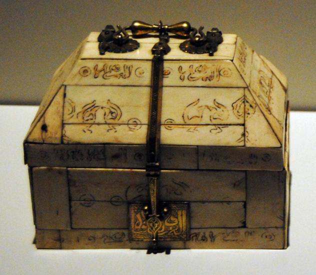 Caja de madera con forma de pirámide truncada cubierta por unas 70 plaquitas de marfil, a diferencia de otras cajas de este tipo las plaquitas no van fijadas con clavos de marfil si no pegadas. Decoración pintada en oro perfilado de castaño oscura, a base de parejas de pequeños pavos reales enfrentados, círculos y palmetas muy elementales. En dos frisos repite “Felicidad y prosperidad”, tema claramente nazarí. Lleva tres abrazaderas abisagradas de cobre dorado, finamente labradas, dos para la tapa y una con albadilla para la cerradura.