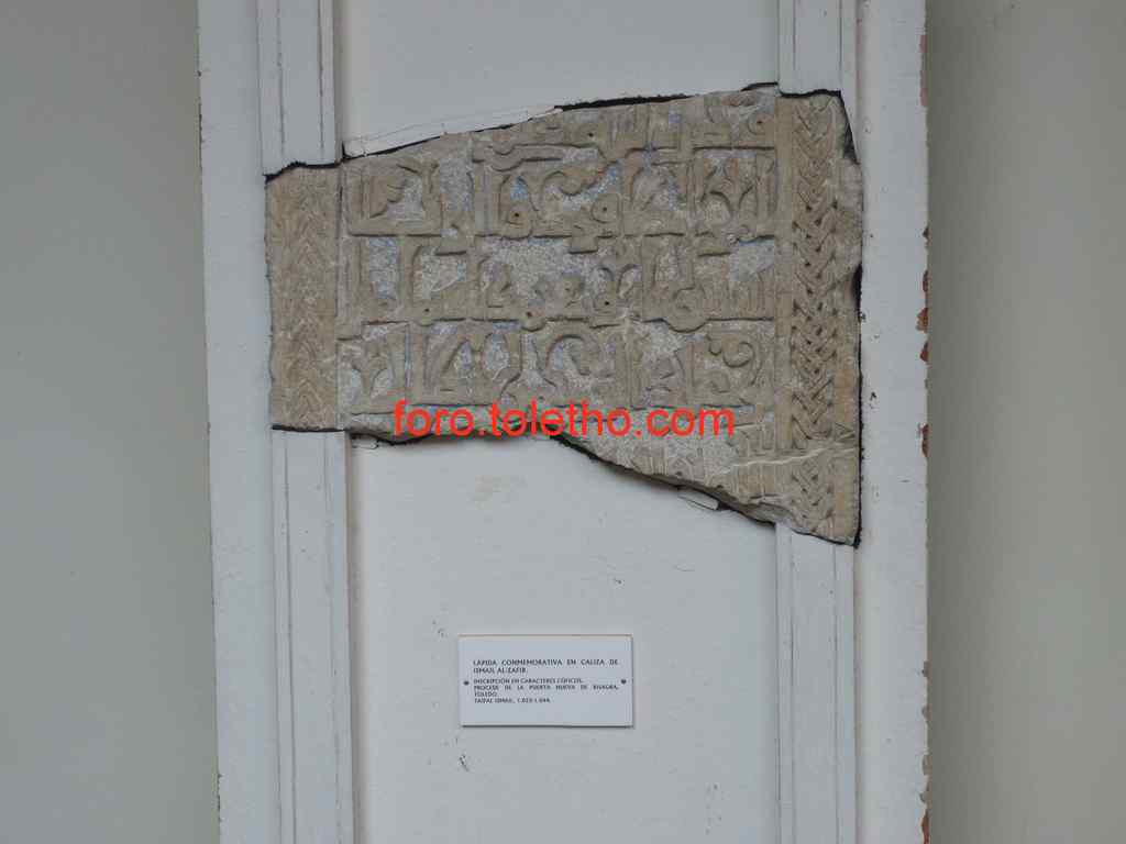 Referencias: Nº de inventario en el Museo de Santa Cruz: 13.191 El texto en árabe y su traducción se pueden consultar online en: "Inscripciones árabes de Toledo época islámica" Elisa Encarnación Gómez Ayllón Tesis doctoral dirigida por Juan Antonio Souto Lasala. Universidad Complutense de Madrid (2006) |