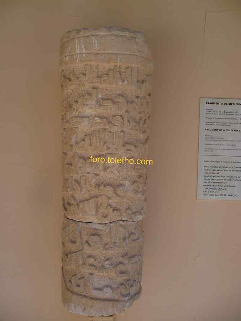 Objeto: Cipo (fragmentado en dos trozos) Contexto cultural: Islámico Datación: 1030 (mayo 1030, 421 de la Hégira) Material: Piedra calcárea Procedencia: Carretera de Santa Olaya (Toledo) Ubicación actual: Museo de Santa Cruz (Toledo) Estado de visibilidad actual: Visible Dimensiones: 63 cm de altura, 17,5 cm de diámetro. (Campo epigráfico: 33,5 cm de anchura máxima y 45,5 de altura. |