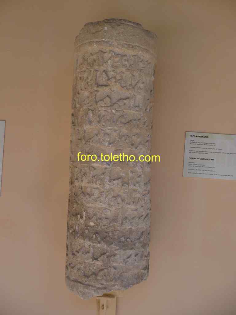 Objeto: Cipo Contexto cultural: Islámico Datación: (febrero 1030, 421 de la Hégira) Material: Piedra caliza Procedencia: Posiblemente de la Vega Baja, “rescatado” en anticuario de Madrid en 1958 Ubicación actual: Museo de Santa Cruz (Toledo) Estado de visibilidad actual: Visible Dimensiones: 70 cm de altura, 17,5 cm de diámetro. (Campo epigráfico: 37,5 cm de anchura máx. y 58,5 de altura) |