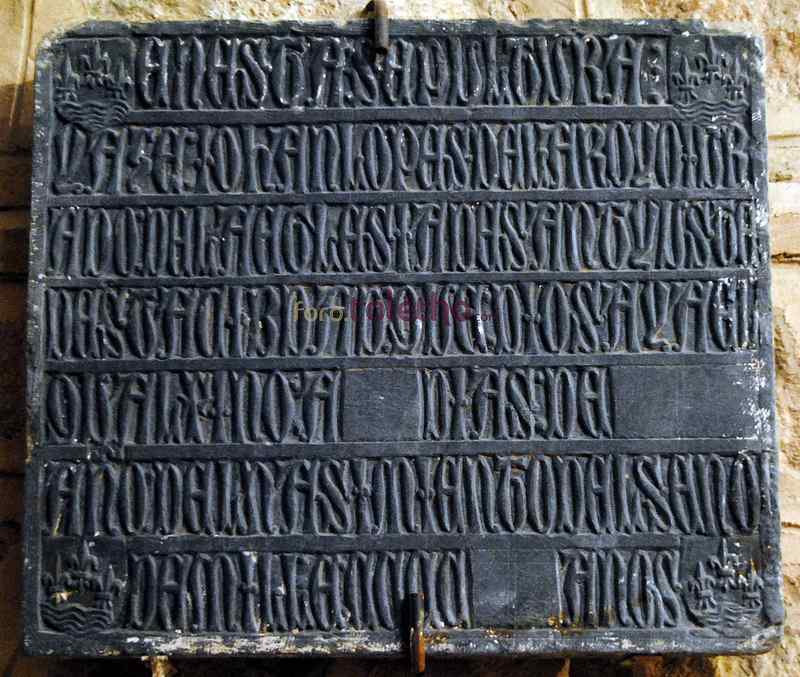 Referencias: Nº Inventario del Museo de los Concilios: ¿151? Siete líneas en caracteres góticos, con escudo heráldico en las cuatro esquinas de la lápida (tres flores de lis, una en jefe y dos en punta, sobre ondas de agua). La lápida debió ser realizada en vida de la persona para quien se ejecutó, dejando pendiente la grabación de la fecha de fallecimiento, lo cual se haría en los espacios dejados para ello. Están en blanco el día, mes y las últimas cifras del año. Otras dos lápidas en el Museo de los Concilios también tienen espacios en blanco para la fecha de fallecimiento, fichas MAVIT: 000093 y MAVIT: 000094. Un Juan López del Arroyo, escribano público, fue uno de los conversos víctima de la llamada Primera Sentencia-Estatuto de Limpieza de Sangre de Pedro Sarmiento en 1449 (Ruano, 2001). “Notas de epigrafía medieval toledana, con especial referencia a tres inscripciones conservadas en la iglesia de San Román” Lorenzo Martínez Ángel; Anales toledanos, Nº. 38, 2001, págs. 33-38 “Museo de los Concilios de Toledo y de la Cultura Visigoda” Matilde Revuelta; Guías de los Museos de España; Servicio de publicaciones del Ministerio de Educación y Ciencia, 1973; pág. 76. Texto de la «Sentencia-Estatuto de Pero Sarmiento» publicado en: “Los orígenes del problema converso” Eloy Benito Ruano; Biblioteca Virtual Miguel de Cervantes, 2003; Edición digital basada en la de Madrid, Real Academia de la Historia, 2001. |