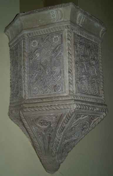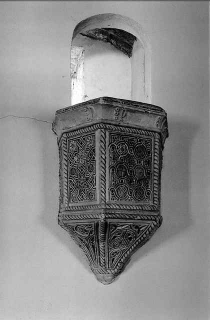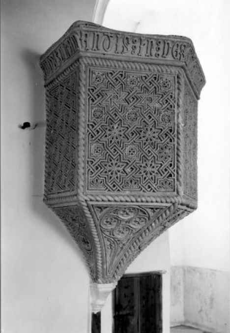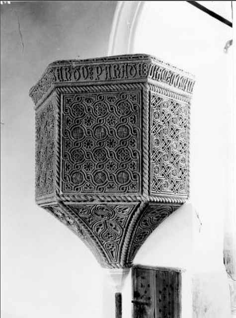 Referencias: • Segunda mitad siglo XIV principios del XV (AMADOR DE LOS RÍOS, 1874), poco antes de la segunda mitad del siglo XV (GALAN VERA y PEÑA SERRANO), finales del siglo XV comienzos del XVI (MARTINEZ CAVIRO, 1980) • Púlpito decorado con yeserías de labor de lazo muy tardía, tracerías góticas arcaizantes, consta de tres cuerpos no excediendo su altura total de 1,952 m. El primer cuerpo consta de una columna, cuyo fuste mide 0,525 m, coronada por un capitel sencillo sobre el que se asienta otro más grande, que recibe la imposta con una altura de 0,21 m. El segundo cuerpo de 0,47 m de altura presenta cuatro fases distintas que se van ensanchando desde 0,10 m en la parte inferior a 0,48 m en la superior. El tercer cuerpo es la tribuna de planta irregular que consta de cuatro fases o frentes. Mide la planta de esta tribuna un ancho de 1,24 m x 0,99 de altura. Las cuatro fases tienen unas anchuras respectivas de 0,32 m, 0,52 m, 0,58 m y 0,40 m (de derecha a izquierda). Cierra la tribuna un coronamiento de 0,20 m de alto x 1,37 m de ancho con una inscripción en caracteres góticos, donde se lee según Amador de los Ríos VOX: CLAMANTIS : IN : DESERTO : PARATE : VIAM :DOMINI • El púlpito fue vendido a mediados del siglo XX al Monasterio de Yuste donde puede verse hoy día profundamente transformado. Según se puede ver en fotografías actuales ha sido recortado de forma drástica y la inscripción prácticamente se ha perdido. • Presenta características similares con un púlpito que se encuentra en la iglesia de Santiago el Mayor (Santiago del Arrabal) de Toledo (MAVIT 000100) Fotografías: Archivo Histórico Provincial de Toledo. Colección: Fondo Fotográfico Casa Rodríguez. Signatura: ALBUM-D-22, ALBUM-D-23. Copia digital Archivo de la Imagen Junta de Comunidades de Castilla-La Mancha Fotografía actuales: Por MiguelHermoso (Own work) [CC-BY-SA-3.0], vía Wikimedia Commons. Yuste. Púlpito refectorio y NAVASCUÉS PALACIO, Pedro; “Monasterios en España: arquitectura y vida monástica” AMADOR DE LOS RÍOS, José; “Pulpitos de estilo mudéjar en Toledo”. Museo Español de. Antigüedades, 1874, t. III, p. 325-347 GALÁN VERA, María Jesús; PEÑA SERRANO, Pablo; “Noticias sobre la construcción del Monasterio de Santo Domingo el Real de Toledo” MARTÍNEZ CAVIRO, B. “Mudéjar toledano. Palacios y Conventos”. Madrid, 1980. Pág. 389 NAVASCUÉS PALACIO, Pedro; “Monasterios en España: arquitectura y vida monástica”, 2000, Lunwerg, Madrid. ISBN 978-84-7782-560-9; (Licencias Creative Commons: Reconocimiento-Sin obra derivada-No comercial) SIERRA CORELLA, A. “Santo Domingo el Real, de Toledo. Noticias sobre su fundación y su arte” en Revista Española de Arte, Año IV, 1935, pág. 304 |